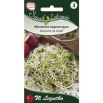 Charakterystyka rośliny Mieszanka zawierająca nasiona: gorczycy, koniczyny, rzeżuchy, rzodkiewki i szczypiorku, których kiełki odznaczają się wybitnymi właściwościami wzmacniającymi, regulującymi pracę organizmu. Jest bogatym źródłem witaminy C oraz łatwo przyswajalnego magnezu i wapnia. Wysiew kiełków: Produkcje kiełków najłatwiej prowadzić na kiełkownicy: wypłukane nasiona zamoczyć na 3-6 godzin w ciepłej, przegotowanej wodzie, a następnie równomiernie rozłożyć na siatce naczynia na kiełki. Dodać wody do dolnego poziomu siatki i dbać o jej systematyczne uzupełnianie i wymianę, jednocześnie zraszając nasiona w ciągu kilku następnych dni. Kiełki można także produkować w słoiku: wypłukane nasiona wysypać do czystego słoika i zalać na kilka godzin wodą. Następnie wodę zlać, nasiona przepłukać, nakryć słoik gazą, obwiązać i ustawić w ciepłym, nienasłonecznionym miejscu. Kiełki przepłukiwać i zlewać wodę dwa razy dziennie. Po 4-5 dniach kiełki są gotowe do spożycia. |