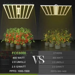 Wysokowydajne oświetlenie LED do uprawy — oświetlenie do uprawy FC-E8000 jest wyposażone w wysokiej jakości diody BridgeLux, które zapewniają wiodącą na rynku skuteczność 2,8 µmol/J. Zużywa 730 watów przy 30% wyższym średnim PPFD niż inne lampy o tej samej mocy, zapewniając lepszą jakość plonów i większą efektywność kosztową oraz obniżając rachunki za energię elektryczną o 50% niż lampy HID/HPS! *Najlepiej pasuje do namiotu do uprawy o wymiarach 150x150 cm , rolnictwa wertykalnego, komercyjnego ustawienia stołu na kółkach i komercyjnych pomieszczeń do uprawy w pomieszczeniach.