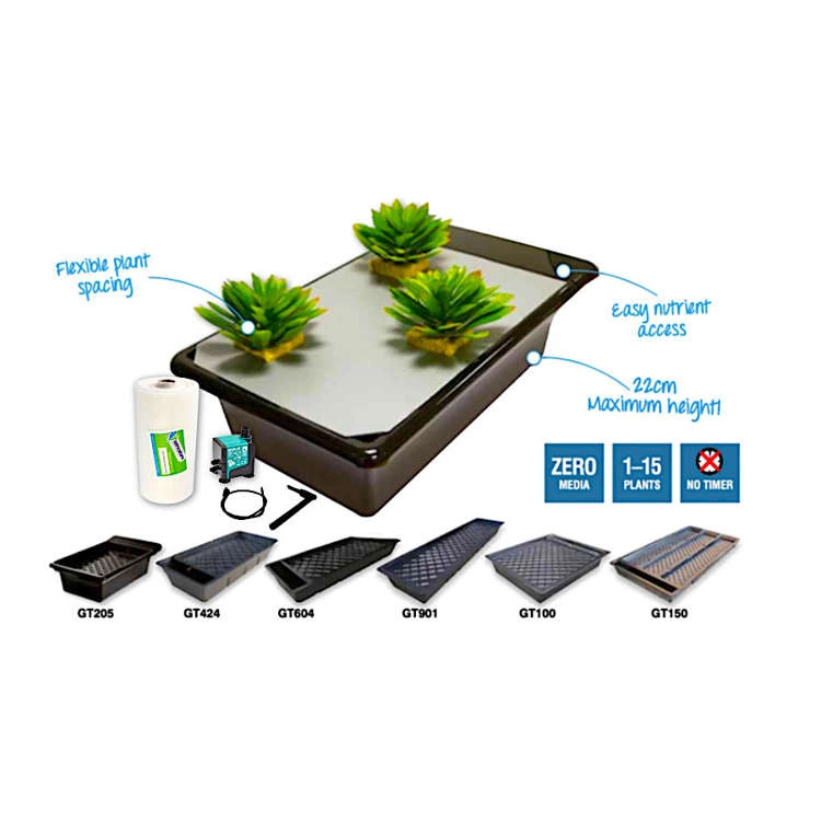 Zestaw NFT Gro-Tank jest pierwszym zestawem hydroponicznym przystosowanym na potrzeby domowych hodowców. Został on wynaleziony w Wielkiej Brytanii w latach 70tych poprzedniego stulecia i przez te ponad trzydzieści lat nie zawiódł jeszcze żadnego ogrodnika. Ma on maksymalnie 30 cm wysokości, a więc twoje rośliny będą miały dużo miejsca na rozwój do linii lamp. Jest wyposażony w niecieknący zbiornik, a więc idealnie nadaje się na poddasza, do sypialni i wynajmowanych mieszkań, gdzie strugi wody cieknące po ścianach nie są tym, co chcielibyście zobaczyć.
