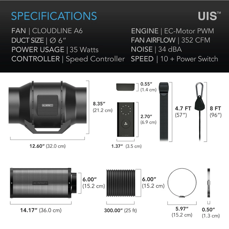 System filtracji powietrza w namiocie hodowlanym ze wszystkimi niezbędnymi komponentami wbudowanymi, których potrzebujesz do wentylacji przestrzeni uprawowej. Zestaw pomoże Ci szybko rozpocząć uprawę i wyeliminuje domysły związane z zakupem ich indywidualnie. Zestaw wentylacyjny zawiera wentylator serii CLOUDLINE z 10-biegowym kontrolerem, który zapewnia wydajną, a jednocześnie cichą pracę. W połączeniu z filtrem węglowym wykorzystującym australijski węgiel drzewny, aby zapobiec wydostawaniu się zapachów z namiotu hodowlanego. Te dwie części są połączone zestawem elastycznych przewodów z czterema warstwami zabezpieczeń, które odpowiednio kierują strumień powietrza. Akcesoria obejmują zaciski kanałowe, tkaninę filtra wstępnego, wieszaki z zaciskami linowymi i paski do zawieszania, aby zakończyć instalację. Ten produkt jest częścią platformy UIS™ (kontrolery i akcesoria od firmy AC Infinity) obejmującej urządzenia do uprawy i inteligentne kontrolery, zaprojektowane tak, aby integrować się ze sobą w celu uzyskania idealnego środowiska uprawy.