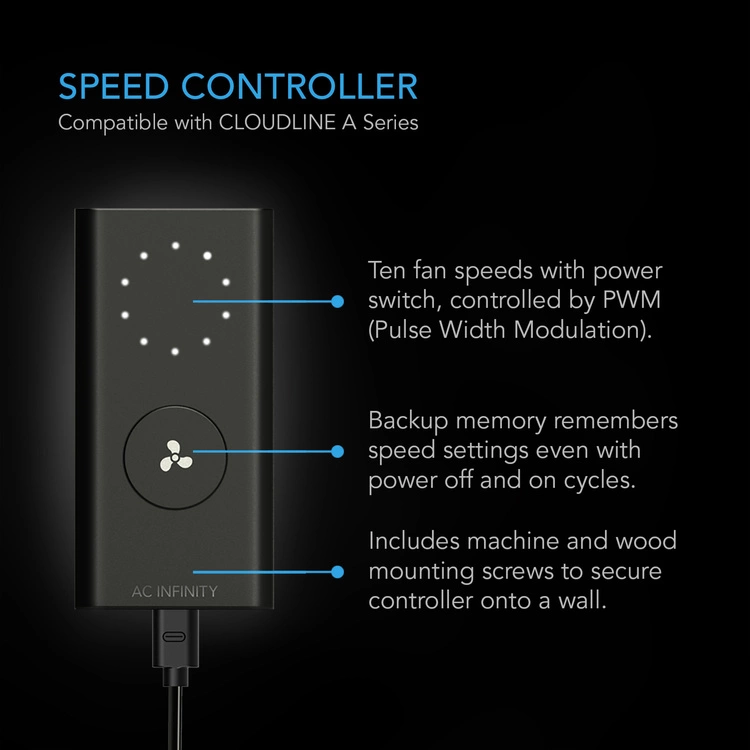 Z tym wbudowanym wentylatorem współpracuje 10-biegowy sterownik wentylatora, aby zoptymalizować poziom przepływu powietrza i poziom hałasu w wielu zastosowaniach. Sterowanie PWM (Modulacja szerokości impulsów) wentylatora umożliwia płynne ustawianie prędkości wentylatora i pracę przy wyjątkowo niskich obrotach bez hałasu silnika. Oprócz tego przewodowego regulatora prędkości CLOUDLINE jest również kompatybilny z różnego rodzaju kontrolerami od firmy AC Infinity, w tym z kontrolerem 69 PRO, który znajdziesz w naszej ofercie.