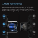 Posiada solidny silnik EC, który został specjalnie przeprojektowany pod względem rozmiaru i konstrukcji, aby wydłużyć żywotność oscylacji. Wykorzystuje bezszczotkową konstrukcję silnika, sprężystą przekładnię ze stali węglowej i podwójne łożyska kulkowe do montażu dookólnego. Posiada również stopień ochrony IP44, aby wytrzymać najbardziej wilgotne pomieszczenia. Komponenty te łączą się, tworząc najcięższy wentylator klipsowy, który jest trwały, energooszczędny i może generować potężną cyrkulację.