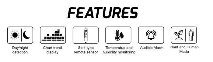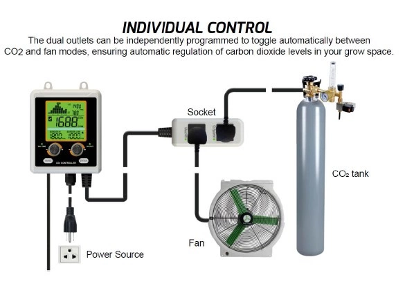 - Podwójne wyjścia sterujące: Funkcje sterowania wentylatorem i urządzeniem CO2 w trybie rośliny (Plant Mode).