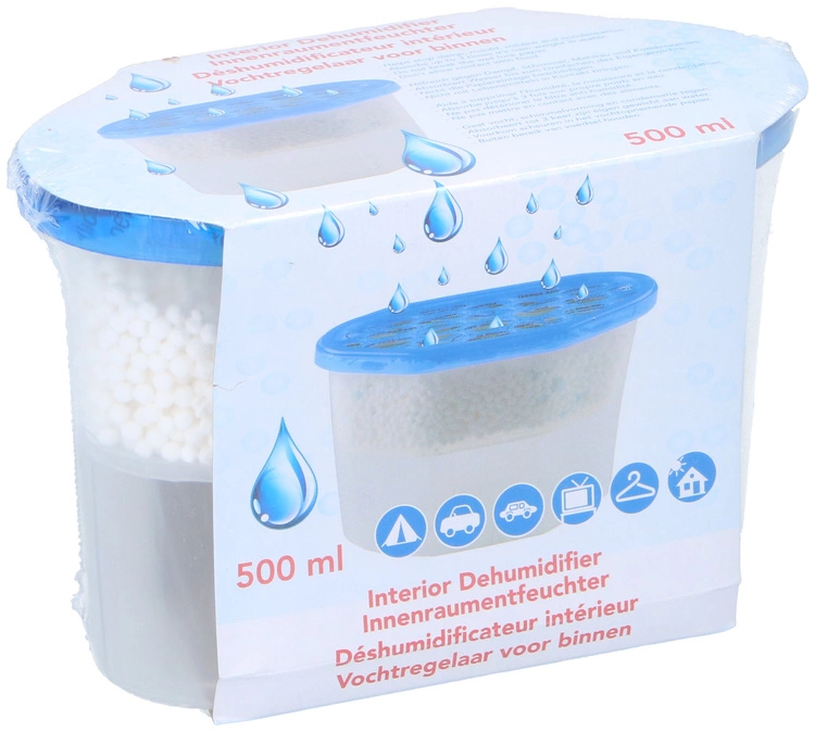 • Pochłaniacz wilgoci 500ml w formie stojącej do łatwego umieszczenia w szafie lub pomieszczeniu, które wymaga osuszenia.