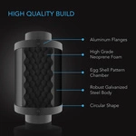 Tłumik akustyczny do kanałów wentylacyjnych zaprojektowany w celu tłumienia lub redukcji hałasu generowanego przez przepływ powietrza w systemach wentylacyjnych namiotów uprawowych lub serwerowni. Wykorzystuje wysokiej jakości piankę neoprenową o falistym wzorze, która tłumi ruch fal dźwiękowych, redukując hałas nawet o 50%. Pianka w kształcie kratki na jajka tłumi drgania akustyczne, umożliwiając jednocześnie maksymalny przepływ powietrza zarówno w konfiguracji wlotowej, jak i wylotowej. Oba aluminiowe otwory kołnierzowe również pomagają w pochłanianiu fal dźwiękowych generowanych przez drgania, idealnie dopasowując się do kołnierza wentylatora kanałowego. Każdy tłumik jest wykonany z solidnej, ocynkowanej stali, odpornej na korozję i ekstremalne zmiany temperatury.