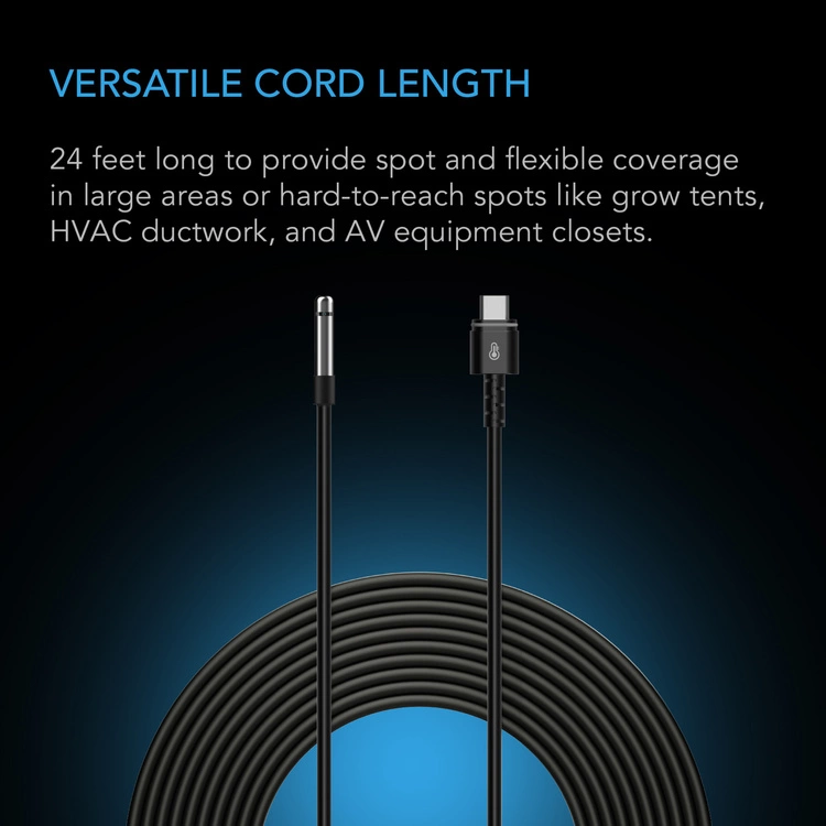Inteligentna sonda czujnikowa zaprojektowana dla kontrolera AI+ do pomiaru temperatury i wilgotności oraz obliczania pomiarów VPD. Dzięki głowicy ze stopu termicznego produkcji szwajcarskiej, czujnik klimatyczny wykorzystuje stal typu 316 SAE, która dostosowuje się do szybko zmieniających się warunków klimatycznych. Pozwala to na precyzyjne odczyty temperatury i wilgotności oraz szybkie dostosowanie inteligentnych urządzeń do wymagań środowiskowych. Przewodowa sonda posiada wodoodporną uszczelkę, która blokuje rozpryski wody i kurz, dzięki czemu kontroler jest odporny na wilgoć i posiada stopień ochrony IP-44. Długość sondy wynosi 7,3 m (24 stopy), co umożliwia zastosowanie w takich zastosowaniach, jak namioty uprawowe, kanały wentylacyjne HVAC, szopy narzędziowe i szafy na komponenty audiowizualne.