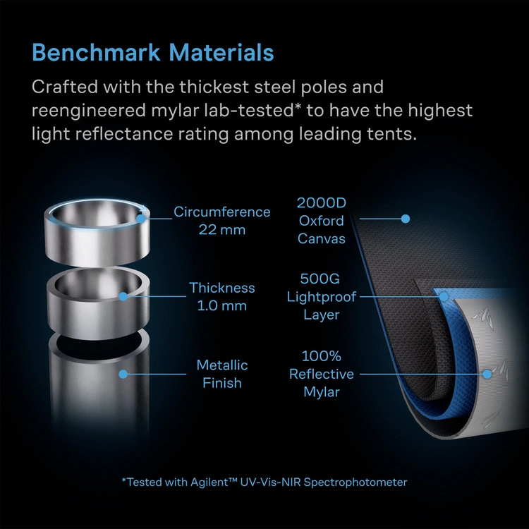 • Najmocniejsze stalowe słupki o grubości 2,5 cm, najgrubsze płótno 2000D, przeprojektowany mylar, przetestowany laboratoryjnie pod kątem najwyższego współczynnika odbicia światła wśród namiotów do uprawy.